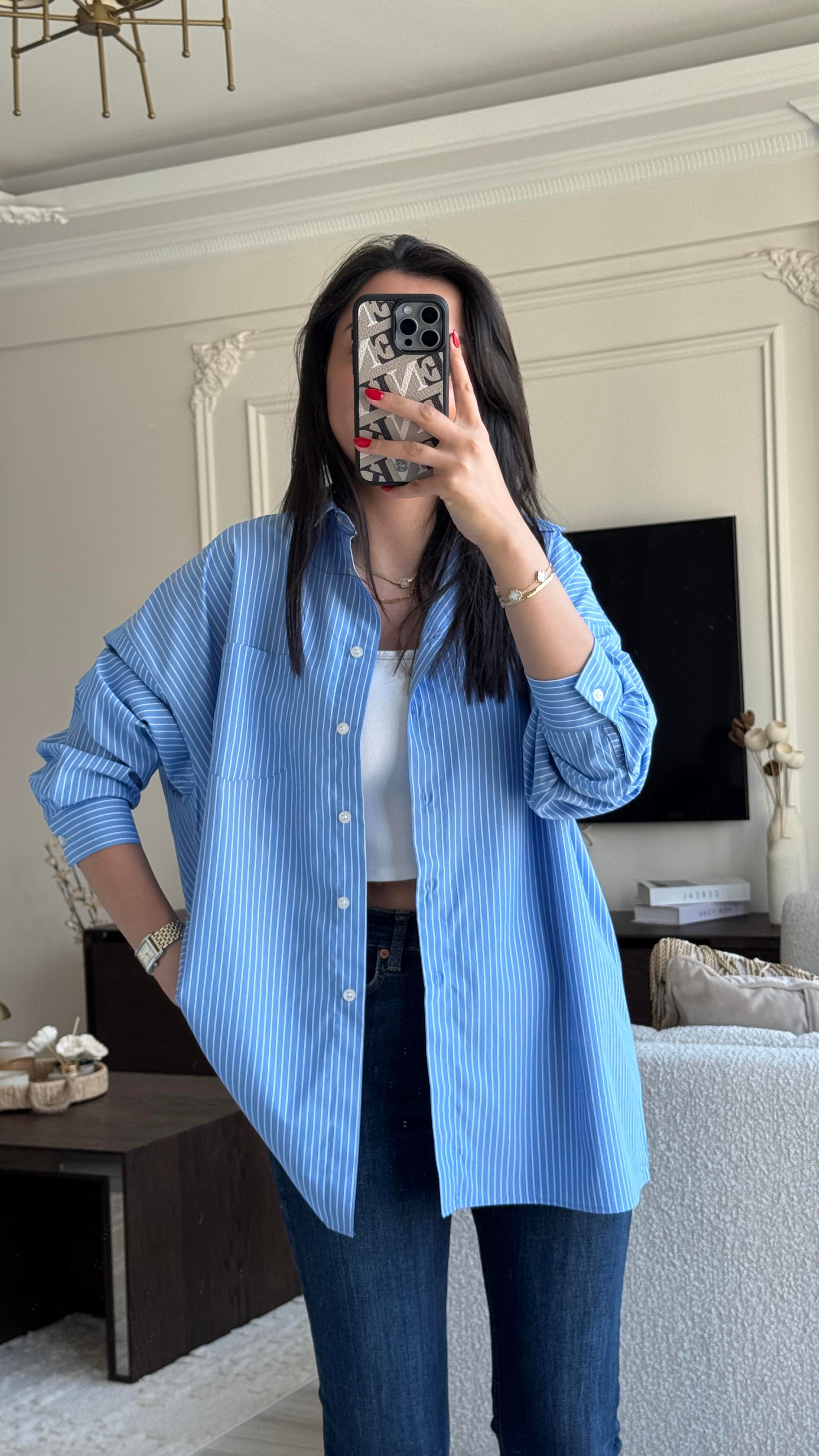 Mavi Çizgili Kırmızı Yazılı Gömlek